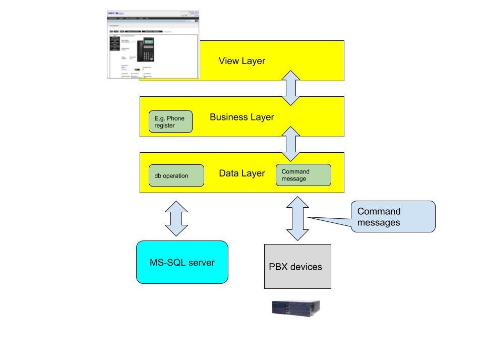 Shown as figure, the system is designed as a traditional 3 layers sturctures. View layer includes UI based on ASP.net which visualize the data and user interation of functions. And the funcion workflow and bussiness defination is implemented in business layer. The final data layer mainly focus on DB operation and PBX command message communication with PBXEngineSDK which is developed as another project.